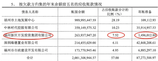 让福州商业地产观察者“说商道市”感兴趣的还有:根据福州古厝集团2024年度财务报表附注,按欠款方归集的年末余额前五名的应收账款情况,福州新区开发投资集团2.64亿元居TOP3,占应收账款合计的7.52%。其中,坏账准备149万元。