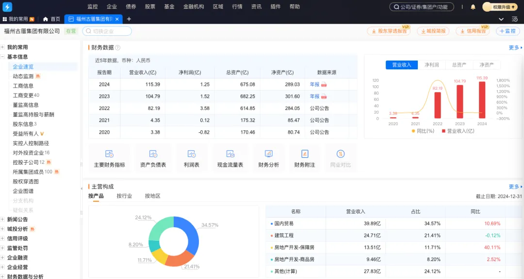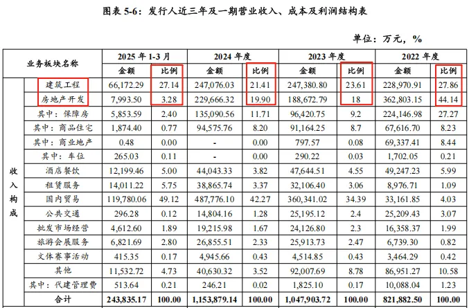 在其主营业务收入构成中,建筑工程+房地产开发业务收入占比2024年、2023年度均超过了40%,而在2022年度,这一占比更是达到了惊人的72%,是福州古厝集团最重要的收入来源。