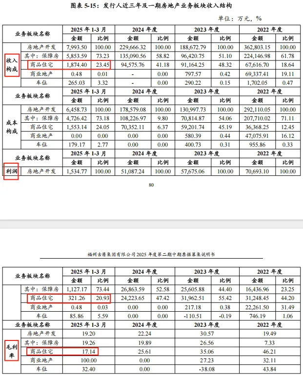 近三年及一期,发行人房产开发业务主要由保障性住房、商品住宅、商业地产以及车位销售构成。无论是收入构成,还是利润构成,抑或是毛利率,跌得重的皆属商品住宅(如下图所示)。