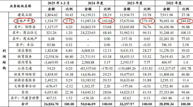利润结构,更是不得了。仅房地产开发单项,近三年(2022-2024年)分别占比达244.63%、173.39%、102.08%。以2022年为例,福州古厝集团主营业务全年利润不过2.9亿元,单单房地产开发一项就贡献了7.1亿元。可见一斑!