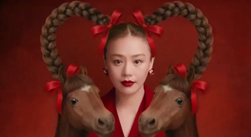 只见两匹留着齐刘海的马在画面中一字排开,它们的鬃毛被编成两条马尾辫绑在一起,发尾黏着一个马思纯就这么从中间缓缓升起,然后对你发射了一颗爱心。