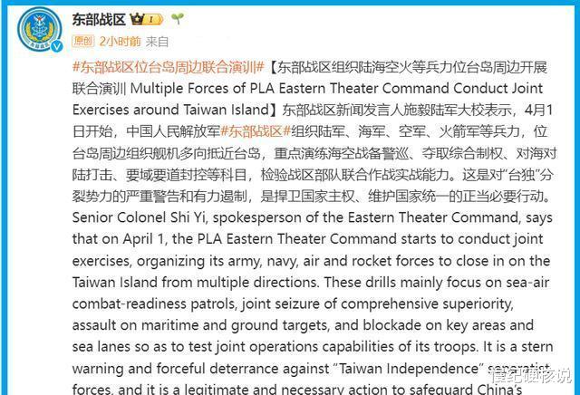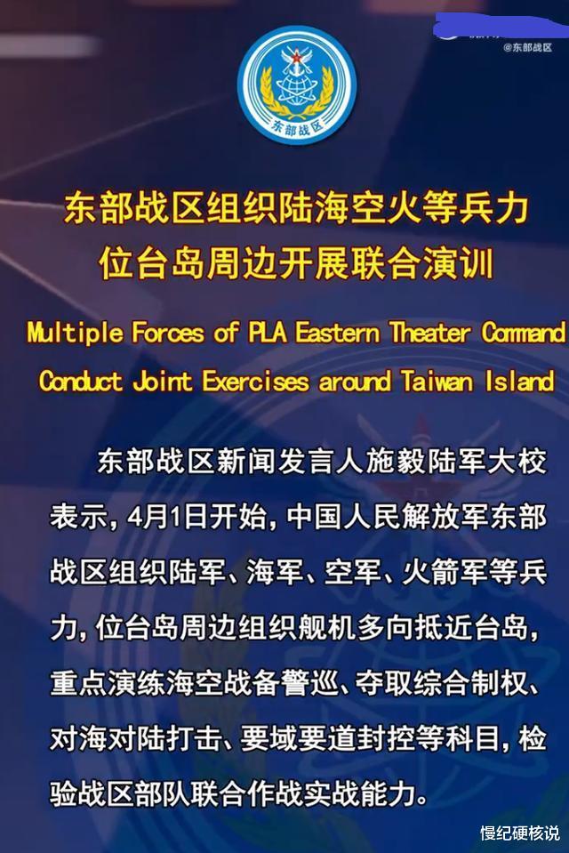 4月1日一大早,消息刚发布,战区部队就迅速行动起来了,相关的战斗单位也都到了自己该去的地方,进入了备战训练的状态。换句话说,等大家听到这个消息的时候,军事大演习其实早就已经开始了。