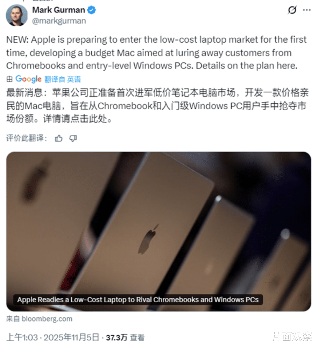 据近日消息,名记马克·古尔曼最新报道称,苹果公司正计划进军低价笔记本电脑市场,这将是其首次推出面向大众价位的笔记本产品。