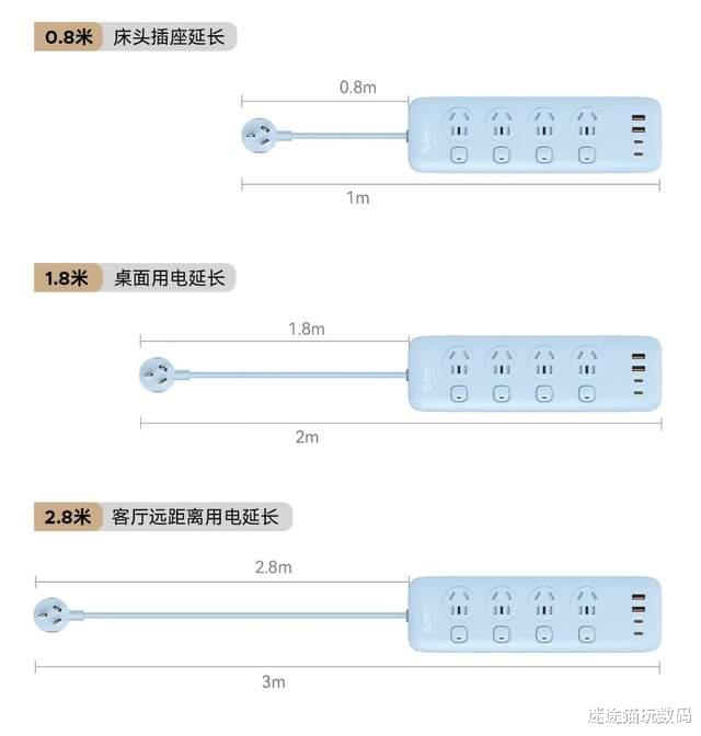 在尺寸设计上,这款插排展现了“小身材大容量”的巧思。整个插排如同一个便携充电宝,可轻松贴靠桌面边缘放置,不会占用过多宝贵空间。特别值得称赞的是其扁平式插头设计,采用一体化成型工艺,不仅插拔省力,即使贴墙使用也不会留出缝隙,完美解决了传统插头贴墙难插入的痛点。线材方面提供1m、1.8m、2.8m三种长度选择,我到手的是1.8m版本,无论是桌面布线还是连接墙角插座,都能灵活适配,避免了线材过长拖地或过短受限的尴尬。