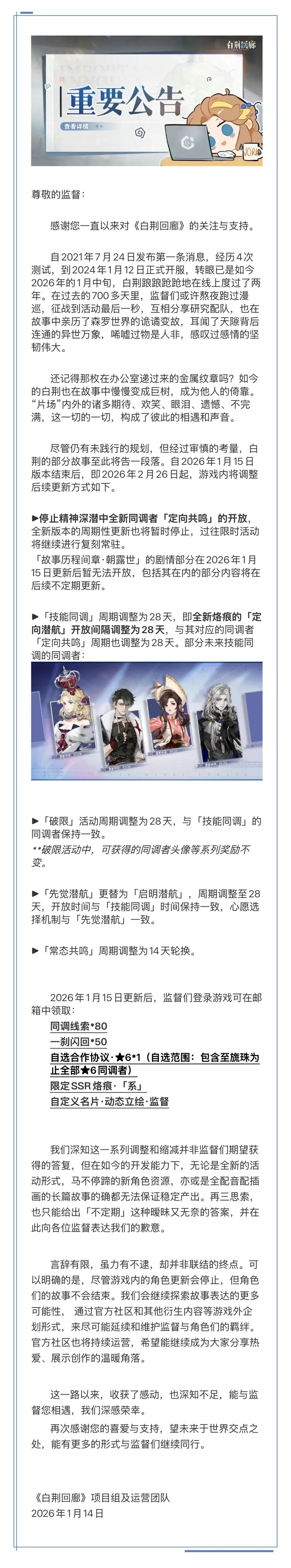 根据公告,游戏将于2026年2月26日起(即1月15日版本结束后),停止新同调者(角色)的「定向共鸣」、「故事历程间章·朝露世」的剧情部分及全新版本的周期性更新。