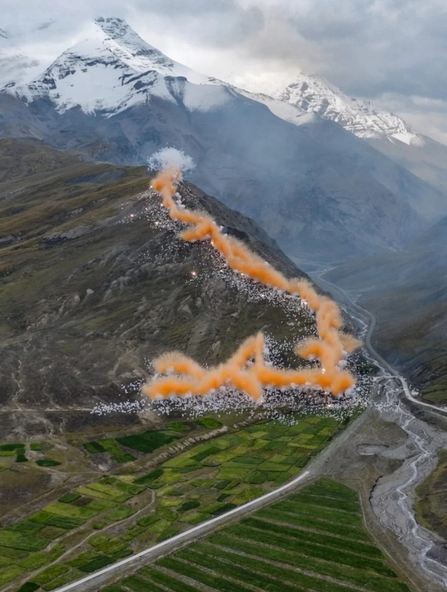 9月19日下午,西藏江孜县热龙乡喜马拉雅山脊线上,当代艺术家蔡国强点燃了烟火。刹那间,三幕烟花依次爆破,形成一条从天而降的“彩龙”。关于这场表演,主办方始祖鸟品牌和艺术家蔡国强称其为“致敬自然”,但公众看到的却是在脆弱高原生态中的一场野蛮表演。