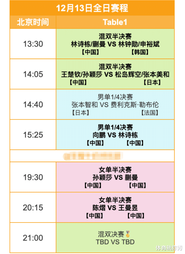 央视也将在下午的时候,直播两场混双半决赛的焦点战,同时晚间的女单半决赛和混双的决赛,央视CCTV也将会进行直播,在周末的时候,球迷们可以为自己喜欢的球员加油助威了!但对于孙颖莎和蒯曼来说,今天的比赛任务还是非常繁重的,下午要进行混双的比赛,晚间还有女单的直接对话,如果混双能够进入到决赛的话,两人都有可能是一天3赛的情况。此前的混合团体世界杯的比赛,孙颖莎、蒯曼、林诗栋和王楚钦,就是球队的主力,也是出战了多场比赛,但和WTT香港总决赛的比赛中间,只有2天的休息调整时间,这对他们的体能也是一个极大的考验。