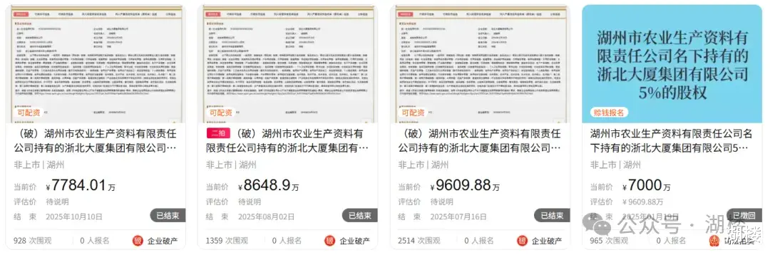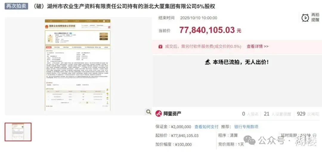 10月10日,湖州市农业生产资料有限责任公司持有的浙北大厦集团有限公司5%股权,又一次因无人报名而流拍了。