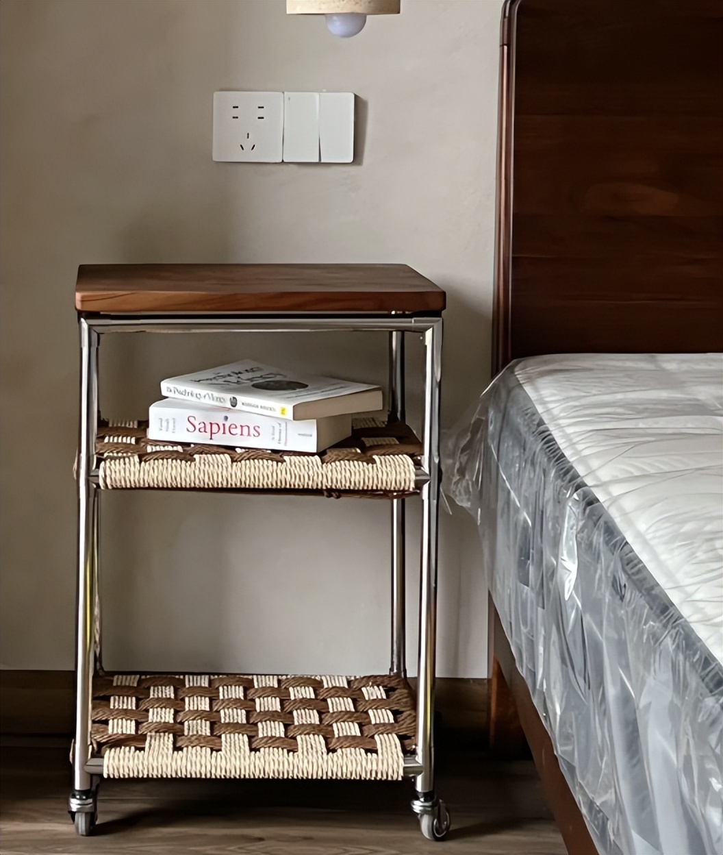 比如,凳子、脏衣篓、伸缩支架搭配着托盘……这些设计都可以完美平替床头柜,而且性价比特别高。