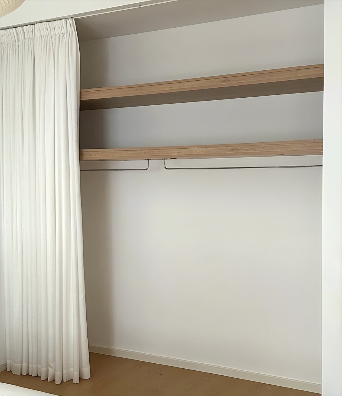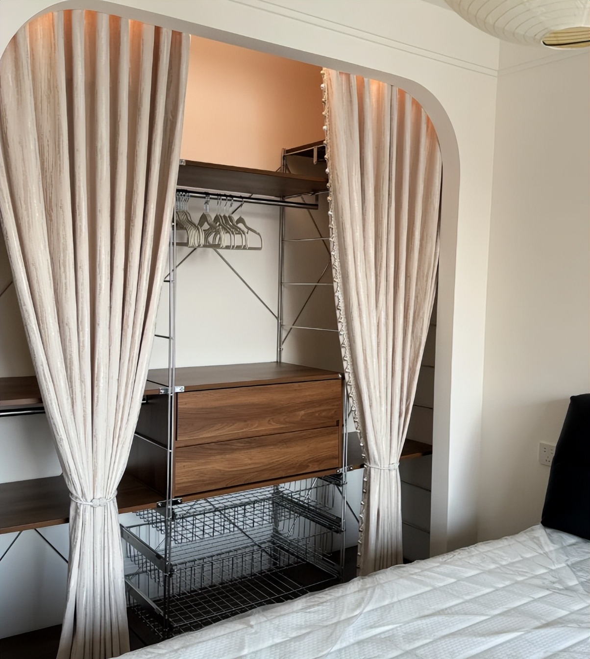 直接把金属架子固定在墙上,外面搭配着布帘就可以了,平时用来收纳衣服效果特别好,挂衣服的空间也特别大。