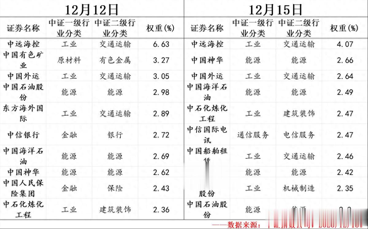 PS:中证指数公司暂未公布指数的详细样本权重数据,但是躺师傅根据港股通央企红利ETF(159266)12月19日的申赎清单做了一个样本权重数据推算,数据贴在文末附件中了。