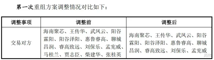2024年10月31日,阳谷华泰发布本次交易预案时,共有14名交易对方,包括海南聚芯、王传华、武凤云、阳谷霖阳、阳谷泽阳、惠鲁睿高、聊城昌润、睿高致远、刘保乐、孟宪威、马桂兰、贾志臣、柴建华、张桂英。