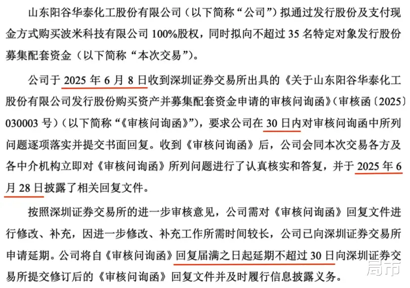 重组审核问询一般要求30日内回复,阳谷华泰于6月28日披露了相关回复文件,但按照交易所进一步审核意见,需对回复文件进行修改、补充,因此公司申请延期不超过30日提交修订后的回复文件。