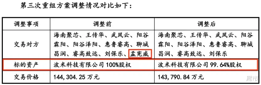 随着孟宪威的退出交易,其持有的波米科技0.36%股份也被剔除出重组方案,也就是说,阳谷华泰收购的波米科技股份比例从原本的100%变成了99.64%。