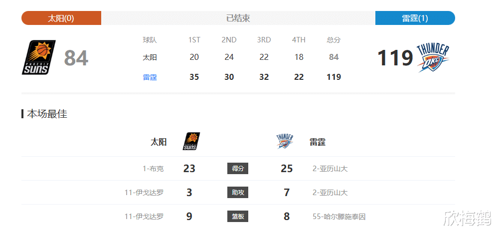 再说本场最佳,太阳这边布克拿了23分,伊戈达拉3助攻9篮板,但这有啥用啊?雷霆的亚历山大直接杀疯了,25分+7助攻,攻防一体!哈尔滕施泰因也抢下8个篮板,配合得天衣无缝!