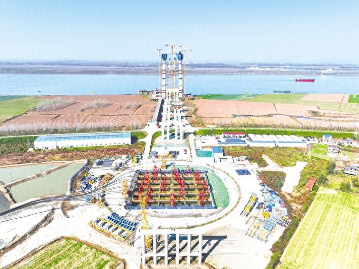 “南锚碇沉井承载主缆传递的巨大拉力,堪称大桥的定海神针。”中交路建汉南长江大桥项目生产副经理李参政介绍,该沉井长宽各76.4米,相当于14个标准篮球场的面积,比在建的世界最长悬索桥——张靖皋长江大桥的锚碇沉井还大。沉井总高43米,分8节浇筑成型,重达16万吨,相当于2艘福建舰的满载排水量。