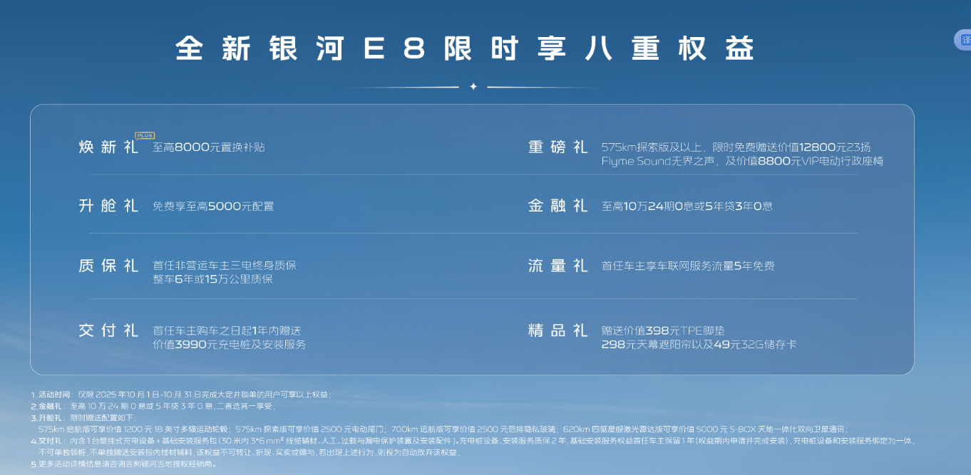 诚意满满的购车权益与品质保障,银河E8限时补贴价13.48万起,还推出八重限时权益:至高8000元置换补贴(吉利本品置换更划算)、至高10万24期0息或5年贷3年0息的金融礼,大幅降低购车门槛;首任非营运车主可享三电终身质保与整车6年或15万公里质保,用车无后顾之忧;此外,还免费赠送充电桩及安装服务、TPE脚垫等实用权益,从购车到用车全周期贴心护航。