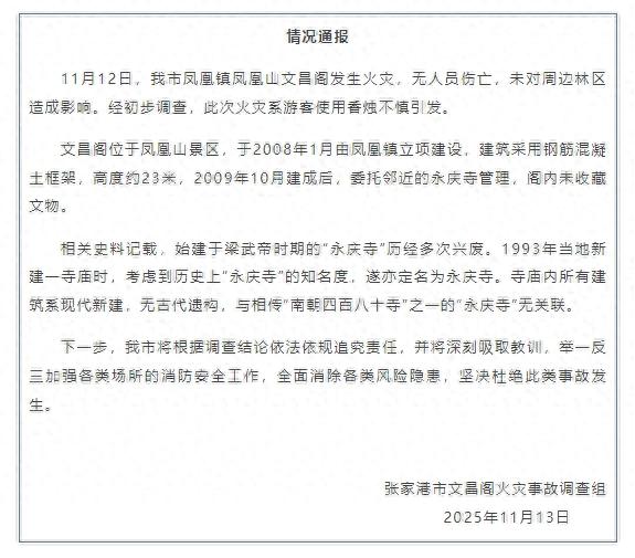 11月13日,张家港市文昌阁火灾事故调查组发布情况通报: