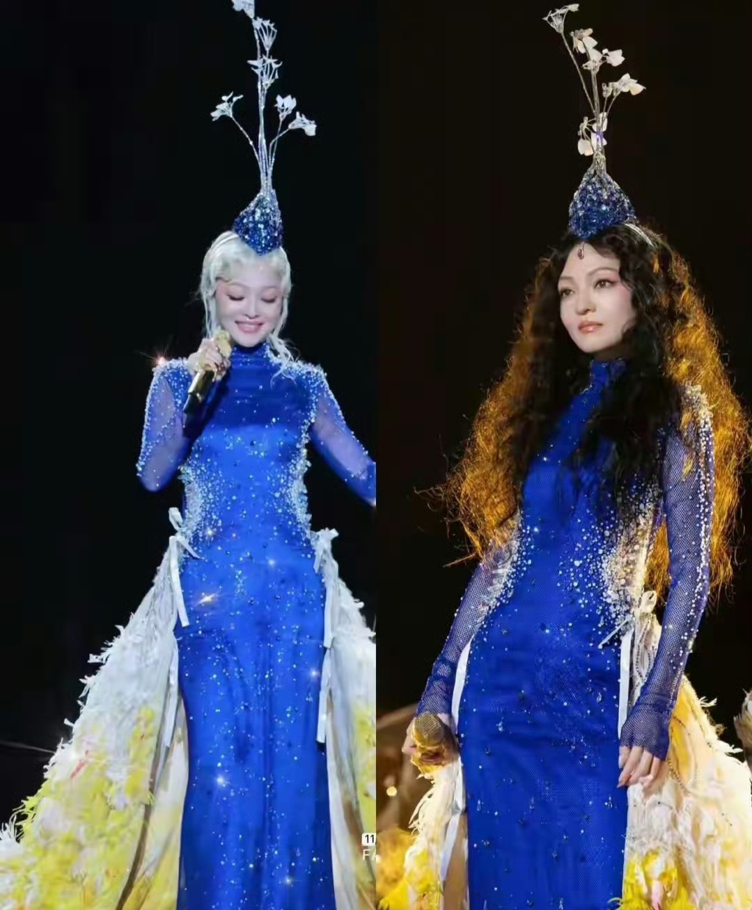 事件的导火索,是张韶涵合作超十年的“灵魂发型师”帕克(张振)的离职。这位被粉丝称为“半永久头皮焊手”的幕后功臣,曾用蓬松卷发、高颅顶造型强化张韶涵的冷白皮与窄脸骨相,打造出《阿刁》中的“复仇女王”、《歌手》里的“精灵神女”等经典形象。然而,2025年下半年,公司突然以“优化成本”为由裁撤了帕克团队,理由竟是“张韶涵脸小,披麻袋都好看”。新团队接手后,汕头站的“泡面头+钢丝球质感服饰”直接让观众瞳孔地震:原本仙气飘飘的薄纱裙因发型沉闷显老十岁,36600小时缝制的60万颗水晶礼服被廉价假发衬得像“地摊货”,甚至连羽毛头饰都被吐槽“像愤怒的小鸟”。