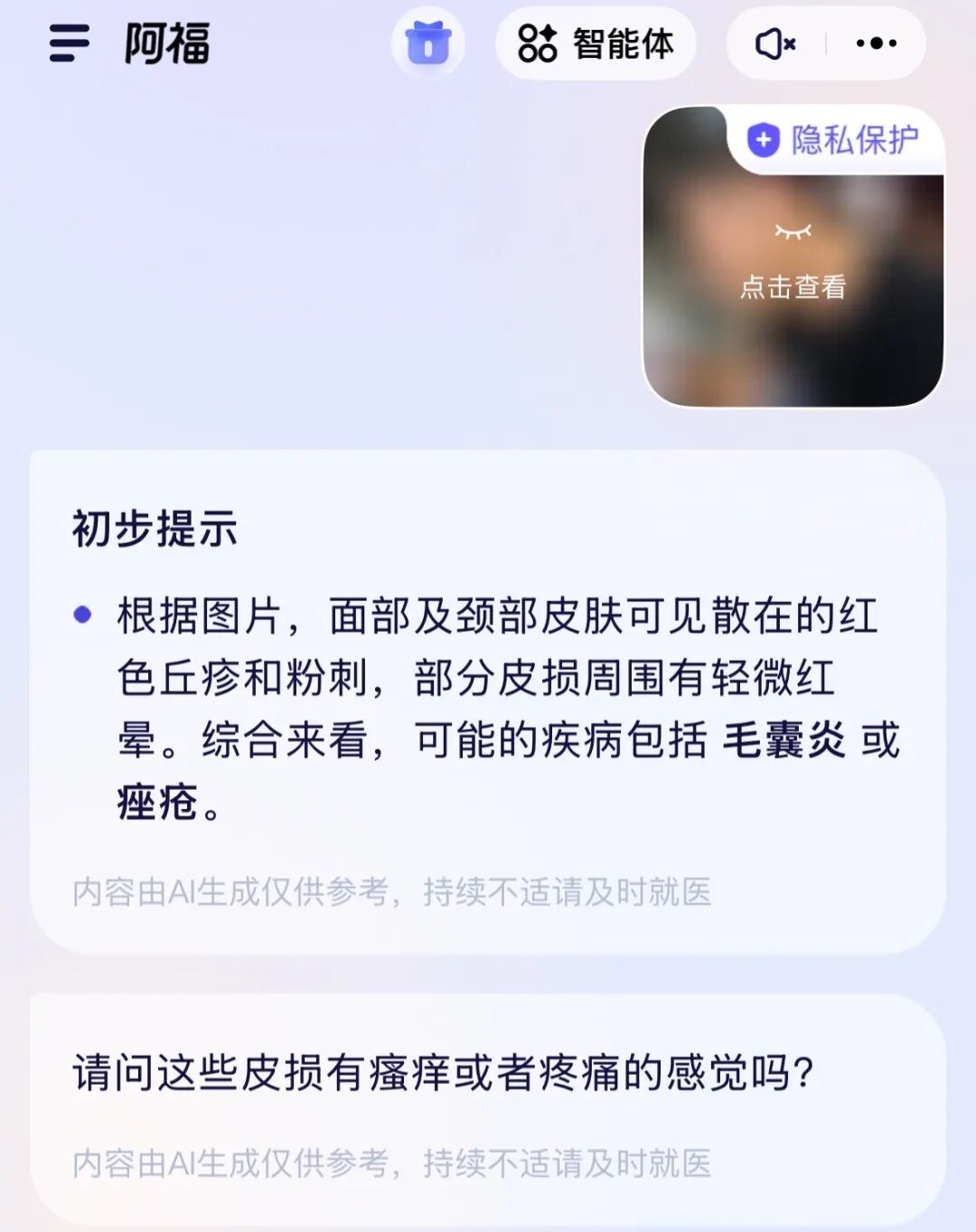 判断专业,条理清晰。全程没有主动推荐任何医生、任何药品,要知道,我之前在网页搜了下“颈部毛囊炎”,出来的第一条就是——“皮肤医院哪家好”这种广告文案,满屏翻下来都没啥靠谱信息。