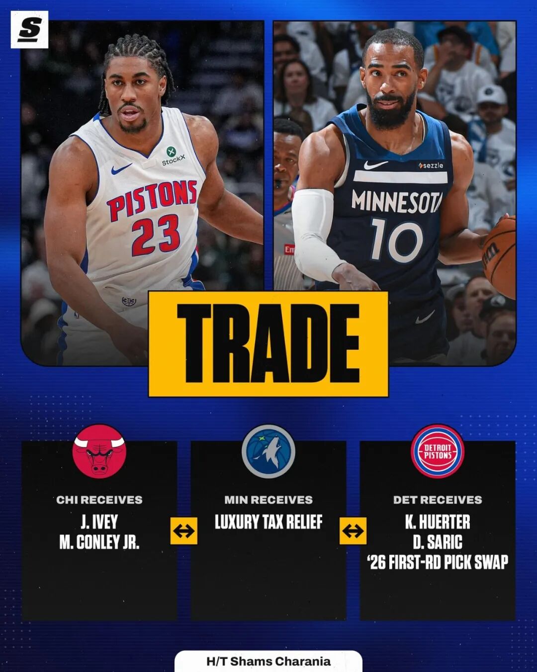 ——活塞得到赫尔特、沙里奇、2026年的受保护首轮互换权(与森林狼)