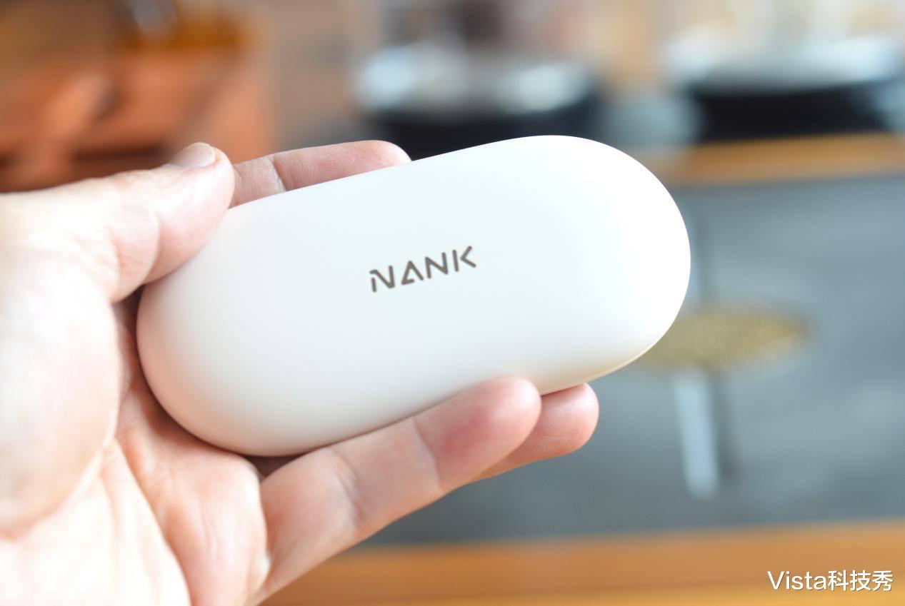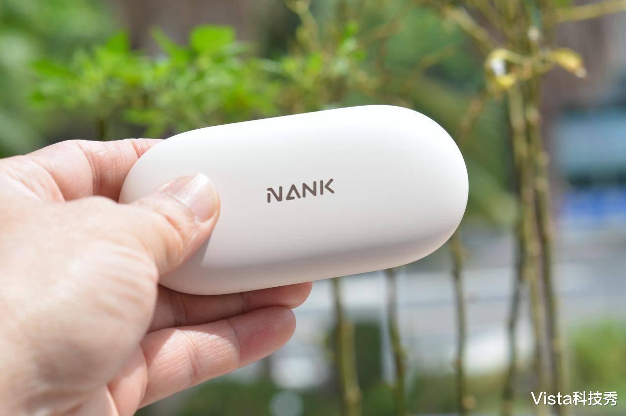 南卡Wing充电仓磨砂质设计,手感细腻舒适,正面有金色NANK品牌LOGO,从侧面看非常薄,仅22mm的厚度,外出非常便携。