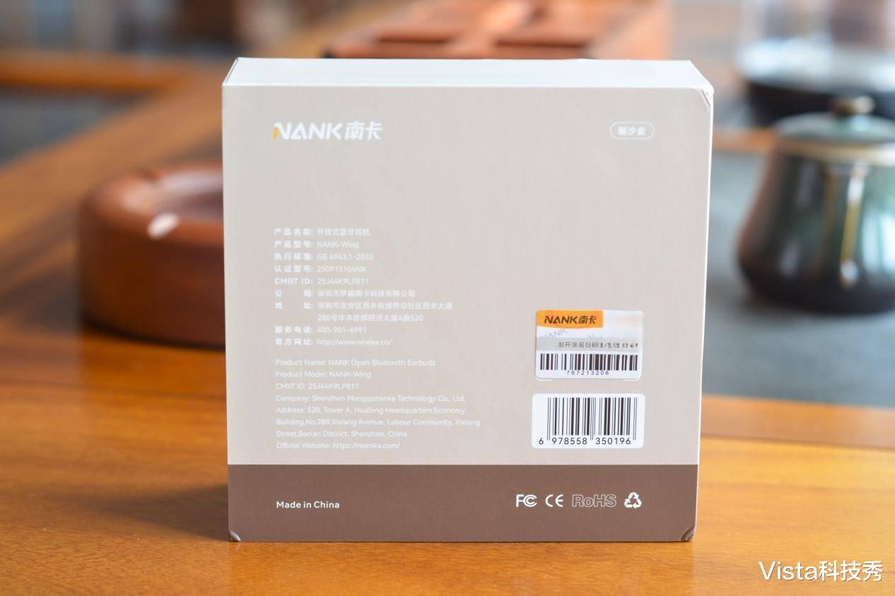 南卡Wing外包装就可以区分本次推出的暮霭黑、暖沙金两款配色,我这款暖沙金配色耳机在外包装正面可见示意图,清晰看到Wing型号,背后为产品信息。