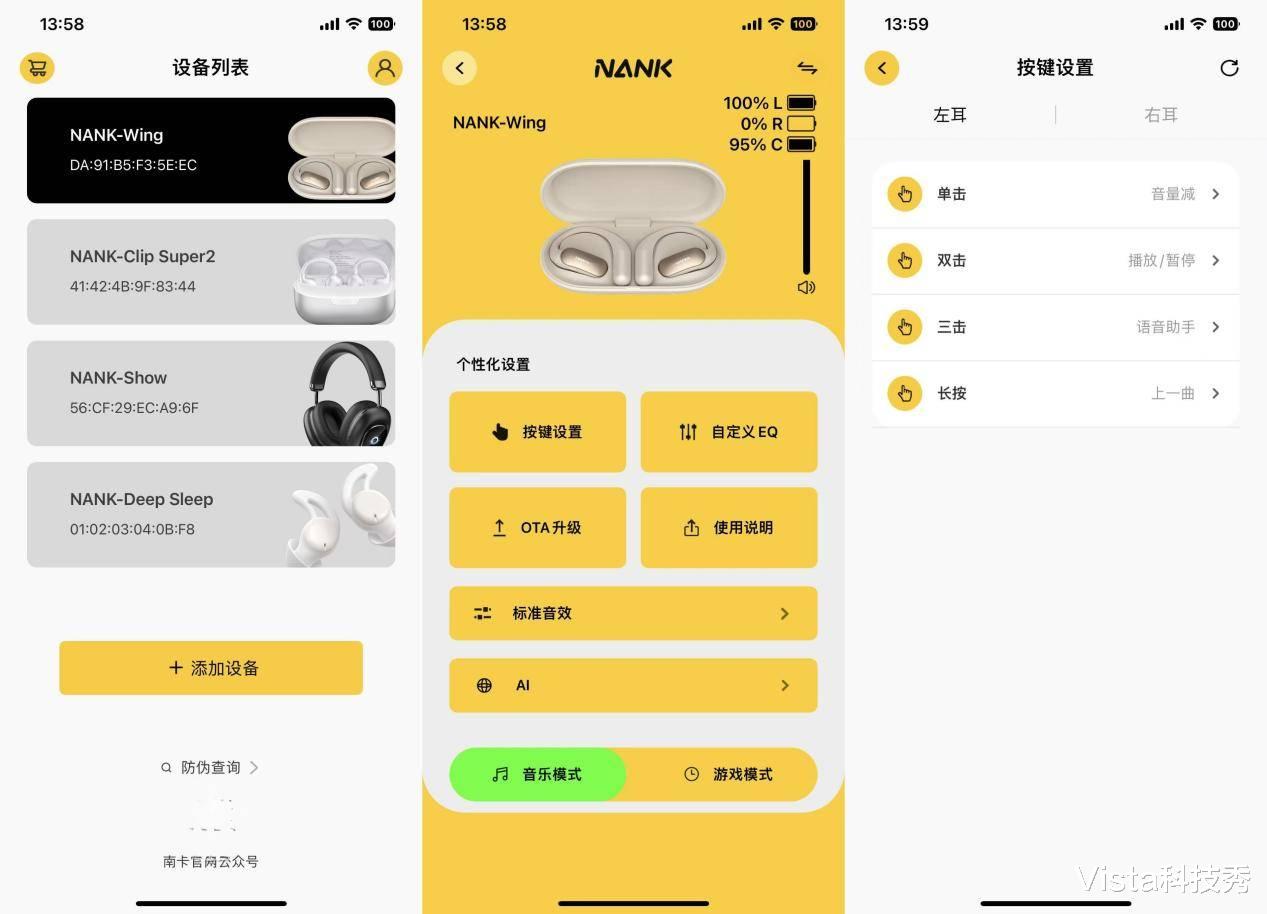 南卡Wing可以连接NANK专属APP,在APP内可以进行按键个性化设置,也可以自定义EQ,还可以选取音乐模式或游戏模式。