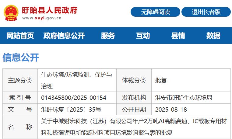 不仅如此,根据江苏省盱眙县人民政府公示信息,“中城财宏科技(江苏)有限公司年产2万吨AI高频高速、IC载板专用材料和极薄锂电新能源材料项目环境影响报告表的批复”文号实2025年,且是在2025年8月才予以公开的。在此背景下,泰金新能却能早在2024年11月就能中标该客户的项目总合同,至于其原因,泰金新能并未接受记者采访。