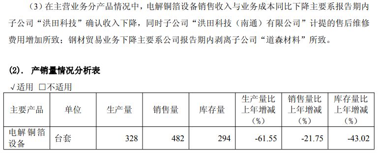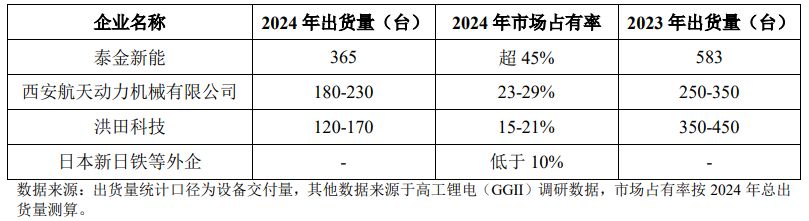 此外,上市公司洪田股份(603800.SH)是泰金新能的同行业可比公司,根据招股书披露,泰金新能2024年的出货量超过了洪田股份两倍以上,但是根据洪田股份此前发布的2024年年报,电解铜箔设备的销售量却高达482台,远超过了泰金新能在招股书中公布的数据。
