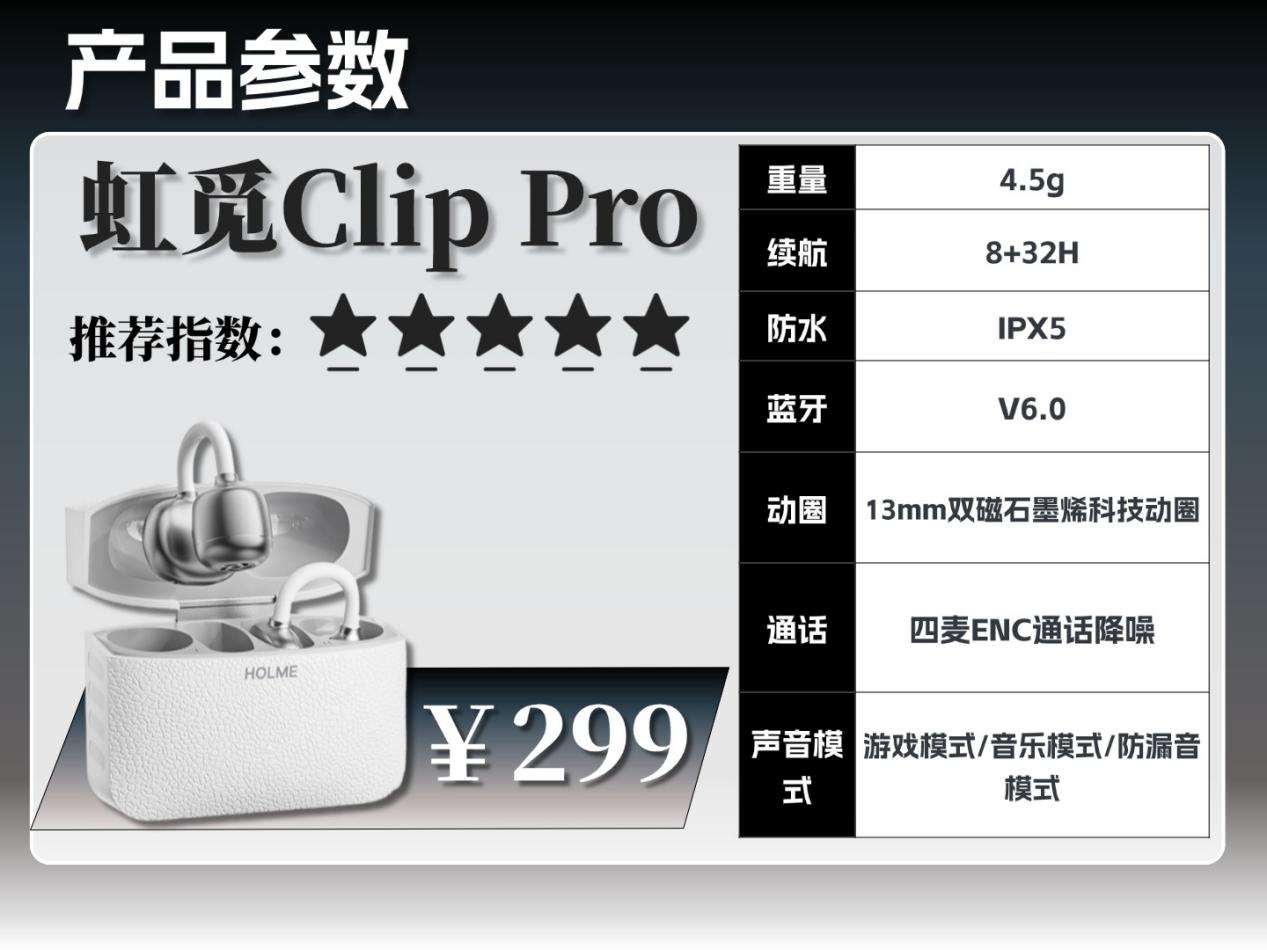 总结预算有限,想要全能款:选虹觅 Clip Pro,佩戴舒服、音质好,不管是日常听歌还是接电话,都能满足需求,就算是第一次买开放式耳机的小白,也不用担心踩坑。