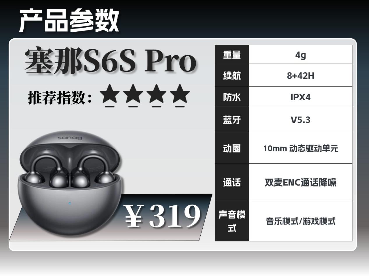 塞那 S6S Pro的优势集中在佩戴和续航上,4克的单耳重量是本期最轻的一款,戴着几乎无感,而且42小时的充电仓续航出差带出门很省心,但动圈和蓝牙版本都是常规水平,如果你想要特别极致的体验可能差点意思。