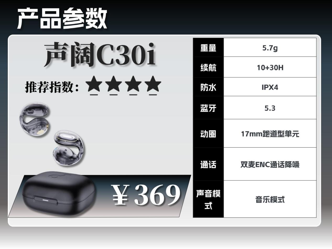 看重音质沉浸感,能接受稍重重量:选声阔 C30i的大动圈和环绕音效让它的声场和解析力都很好,但它戴久了会夹耳朵,价格也比前两款贵 70 元,性价比稍低,更适合对音质有要求、且不会长时间戴耳机的人。
