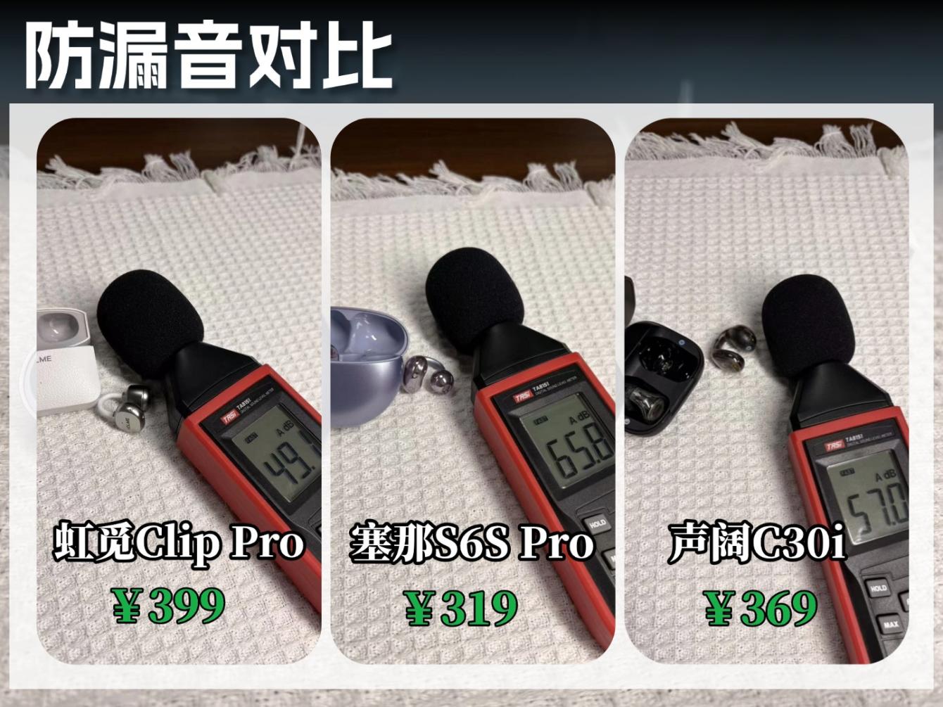 防漏音方面,虹觅 Clip Pro的表现是最好的那款,它有自研的防漏音模式,按三次按键就能开启,通过反向声波抵消漏出的声音,在安静的办公室用也不用担心打扰别人。塞那和声阔虽然也有基础防漏音处理,但在安静环境下,旁边的人还是能隐约听到一点,需要把音量调小些才好。