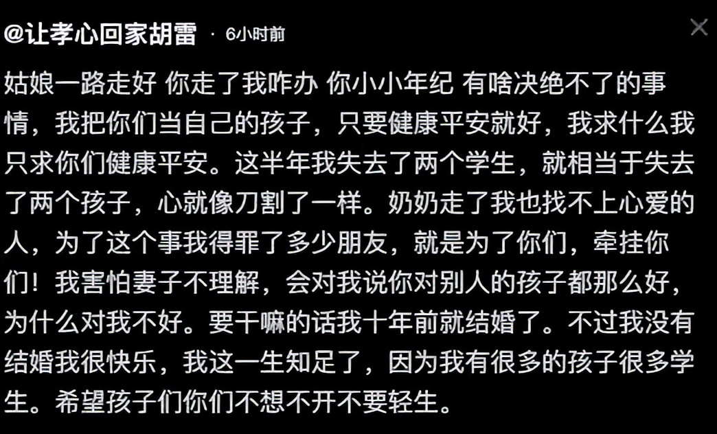 事后,胡磊发声,这半年我失去了两个学生,相当于失去了两个孩子,心就像刀割了一样……希望孩子们不要想不开不要轻生。