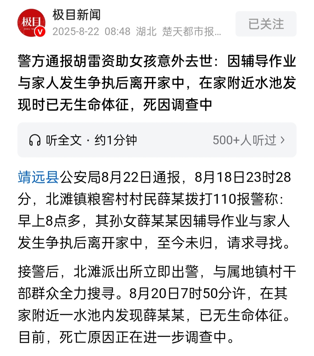 大家都期待着这个女孩健康长大,很可惜,她离开了我们。根据最新的通报,女孩是因辅导作业与家人发生争执,后离开家,最后是在其家附近的一个水塘发现了她,死因还在进一步调查中。