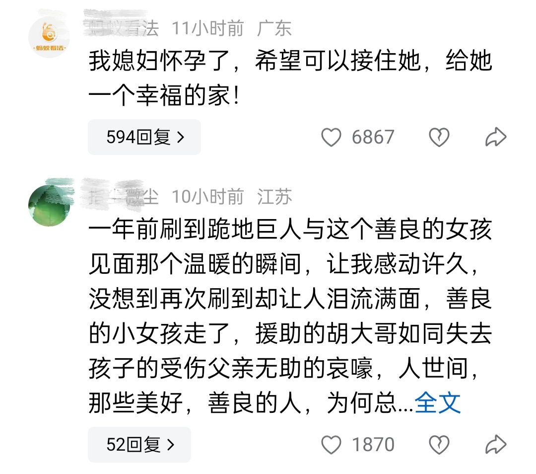 有网友说,一年前刷到跪地巨人与这个善良的女孩见面那个温暖的瞬间,让我感动许久,没想到再次刷到却让人泪流满面,善良的小女孩走了,援助的胡大哥如同失去孩子的受伤父亲无助的哀嚎,人世间,那些美好,善良的人,为何总是命运多舛!