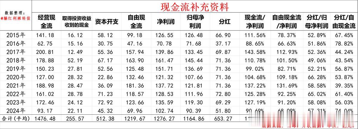 (注,为方便统计,表格中用现金流量表中“购建固定资产、无形资产和其他长期资产支付的现金”作为企业的资本开支数据,考虑到大秦的股权投资和其他金融投资数额比较大,这部分资产产生的股利和利息收入实质上也构成了现金流入,所以把“取得投资收益收到的现金”也纳入现金流计算。)