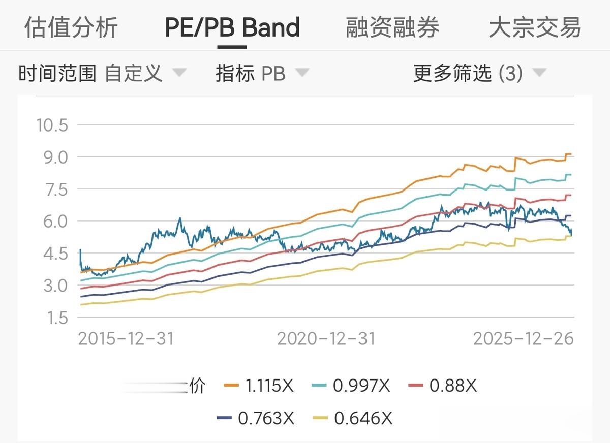 当前市场给大秦铁路开出的报价是15.97倍的市盈率、0.64倍的市净率以及4.17%的股息率,用格派的视角来看,每一块钱大秦铁路股票对应着0.063元净利润、1.563元净资产以及0.042元分红,以格派的保守眼光来看,这个估值挺便宜的,从历史数据来看,当前大秦的估值也算是在底部区间了,下图是大秦近十年的的PB Band图: