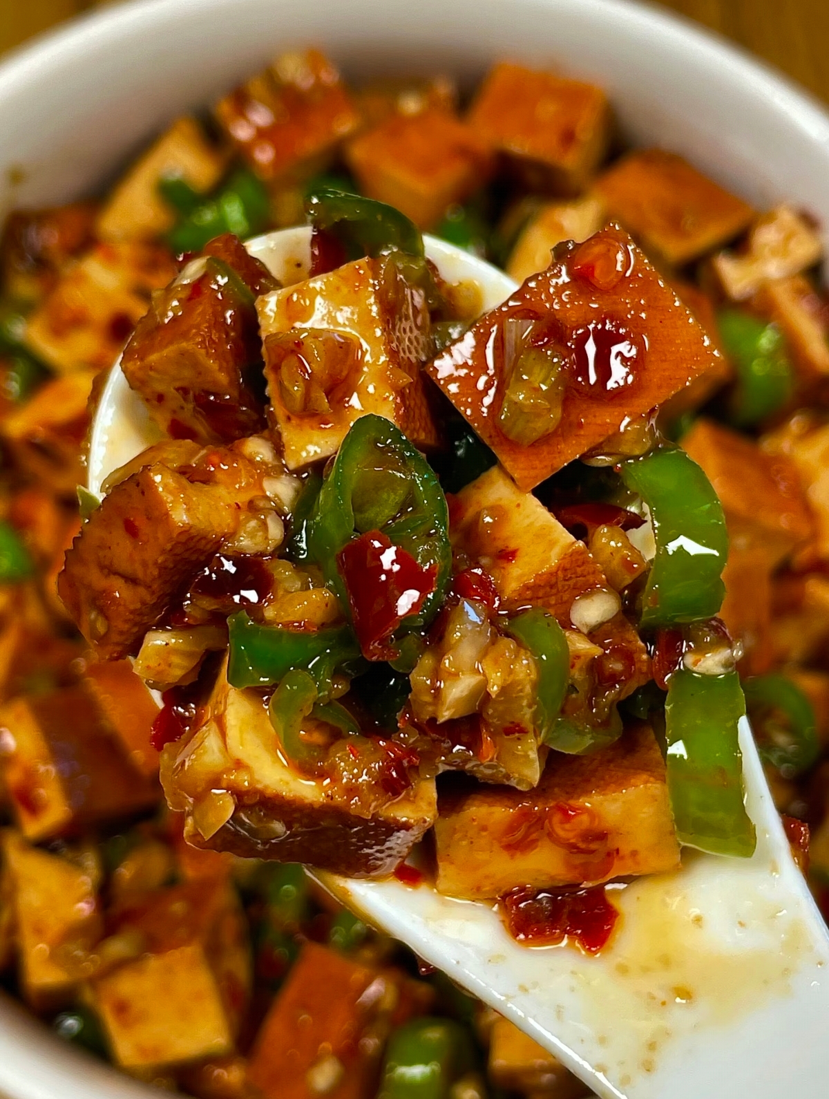 锅中留底油,转大火,投入蒜片、姜丝与葱段爆香。香气四溢之时,倒入辣椒,快速翻炒。看着辣椒皮在高温下微微起皱、变软,那股鲜活的辛辣气息便弥漫开来。此时,将煎好的香干重新倒回锅中,与辣椒一同快速颠勺,让两者的味道在高温中交融。