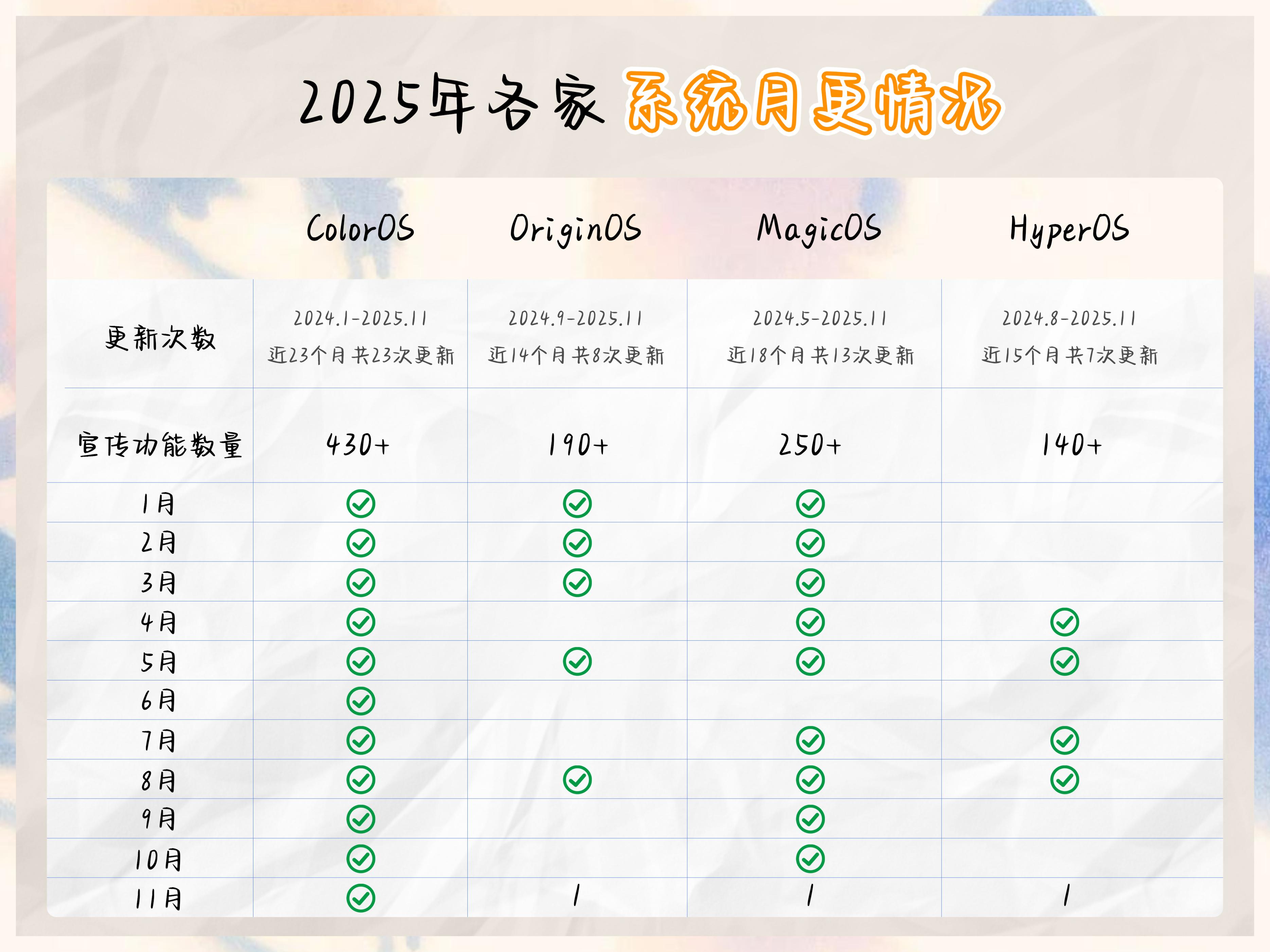 这一套“肌肉记忆”是怎么养成的?很简单,从 2024 年开始,ColorOS 就没让我失望过,每个月一次 OTA,从没缺勤,到现在已经 23 连更。更离谱的是,我抽空翻了下统计表,发现 OPPO 这一波不仅是勤快,更是“长情”——Find X3 这种 2021 年的老旗舰,和 Find X9 这种 2025 年的新机,居然能在同一月份一起收更新。换句话说,我手里这几台手机,跨了六代,但都还在同一个节奏里进化。