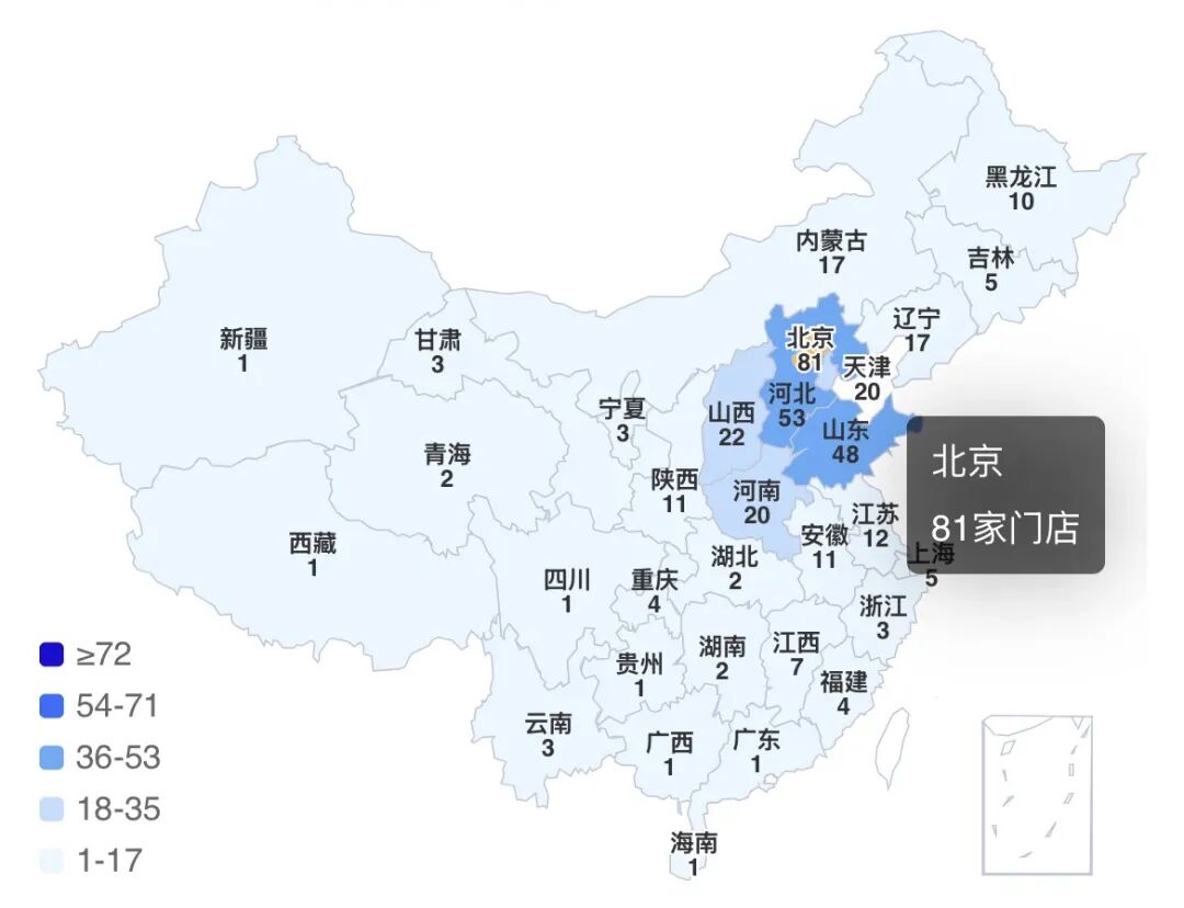 只不过,比格多集中在北方,门店数超过30家的地区,只有北京、河北和山东。而南方市场各地区门店均不超过10家,有的甚至只有一两家。