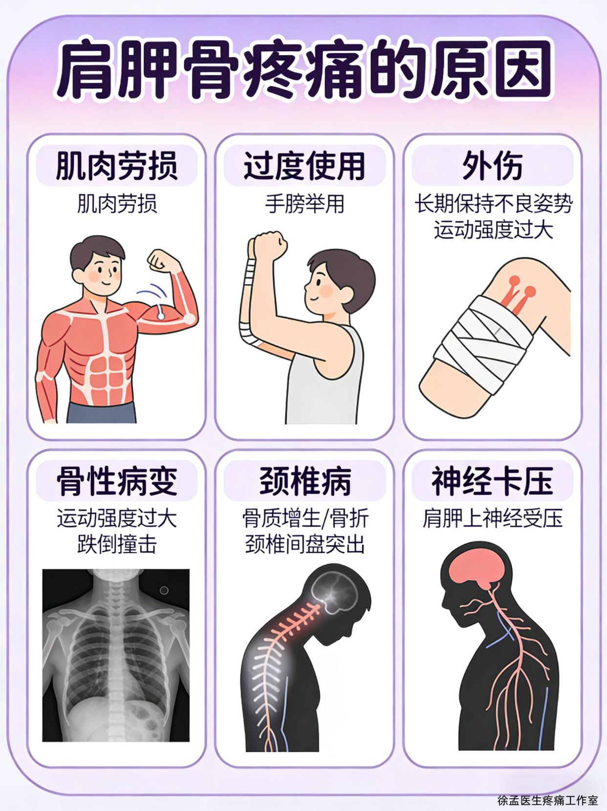 肩胛骨疼痛的原因多种多样,可能与肌肉劳损、过度使用、外伤、骨性病变、颈椎病、神经卡压等因素有关。