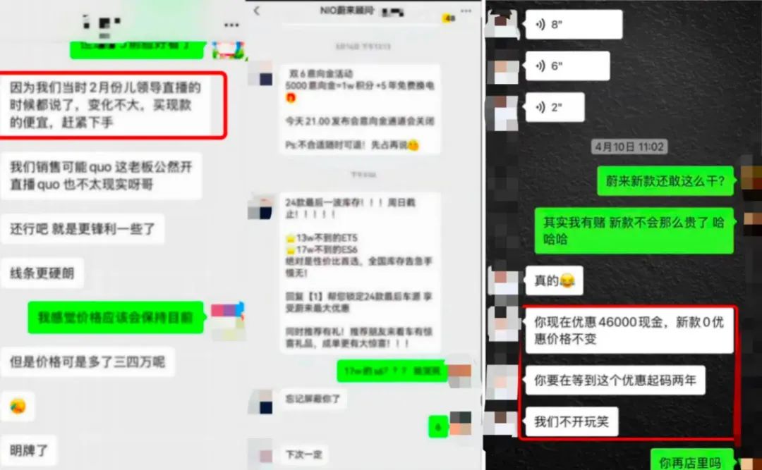 “我们曾是蔚来最坚定的支持者。”“清仓车主”谷明此前还参与了蔚来“用户共创”活动,甚至推荐亲友购车。但如今,这种信任已荡然无存。在维权群中,车主们自嘲为“韭菜”,有人贴出与销售的聊天记录:“销售说‘领导直播的时候都说了,(新款)变化不大,现款更便宜,跟进下手’,结果政策说变就变。”