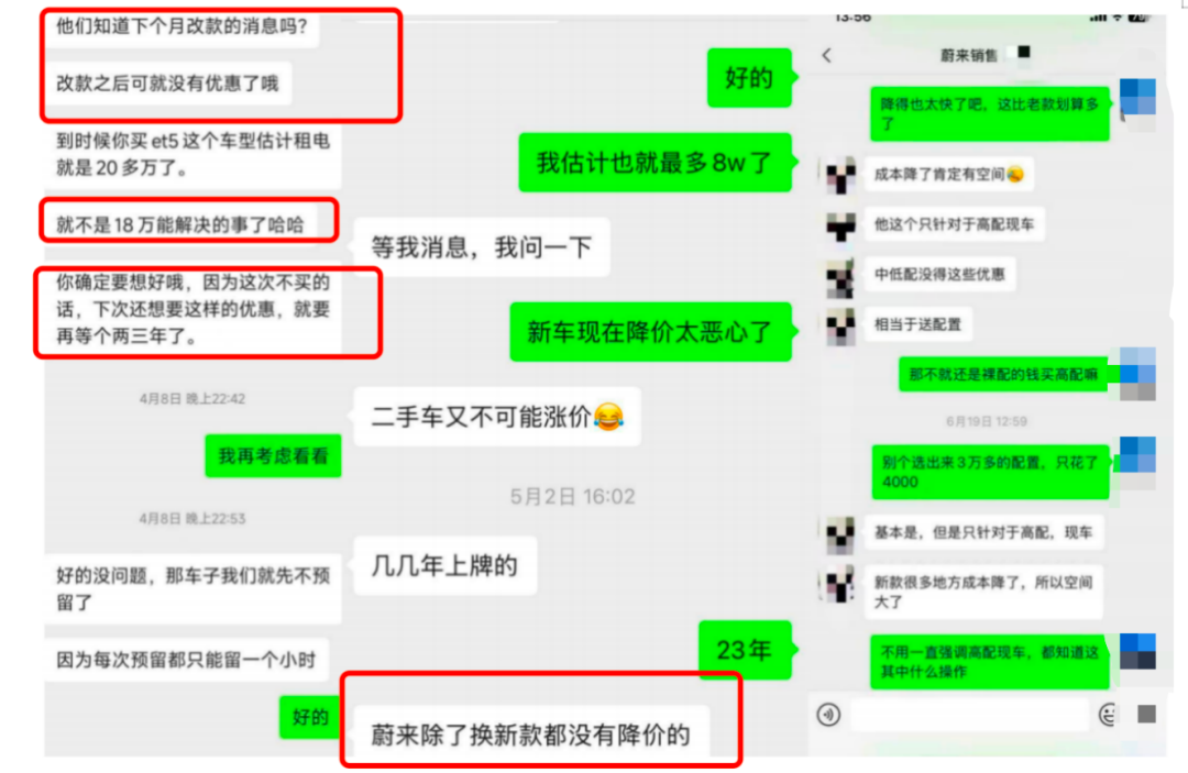 谷明的购车经历颇具代表性。4月底购车时,蔚来销售人员也强势逼单。诸如“当前清仓政策为历史最优”,并表示:“5月上市新款仅升级芯片、竖屏改横屏和些许外观变化,必然涨价”“此刻不上车将永久错失”。他最终以“清仓优惠价”购入2024款ET5T。