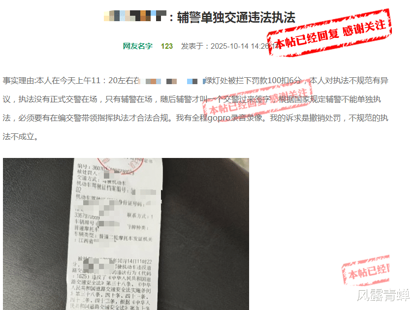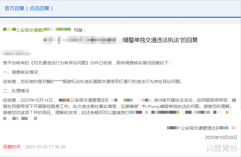 2025年10月14号下午2点26分,江西省某市某区一位市民投诉“辅警单独交通违法执法”。