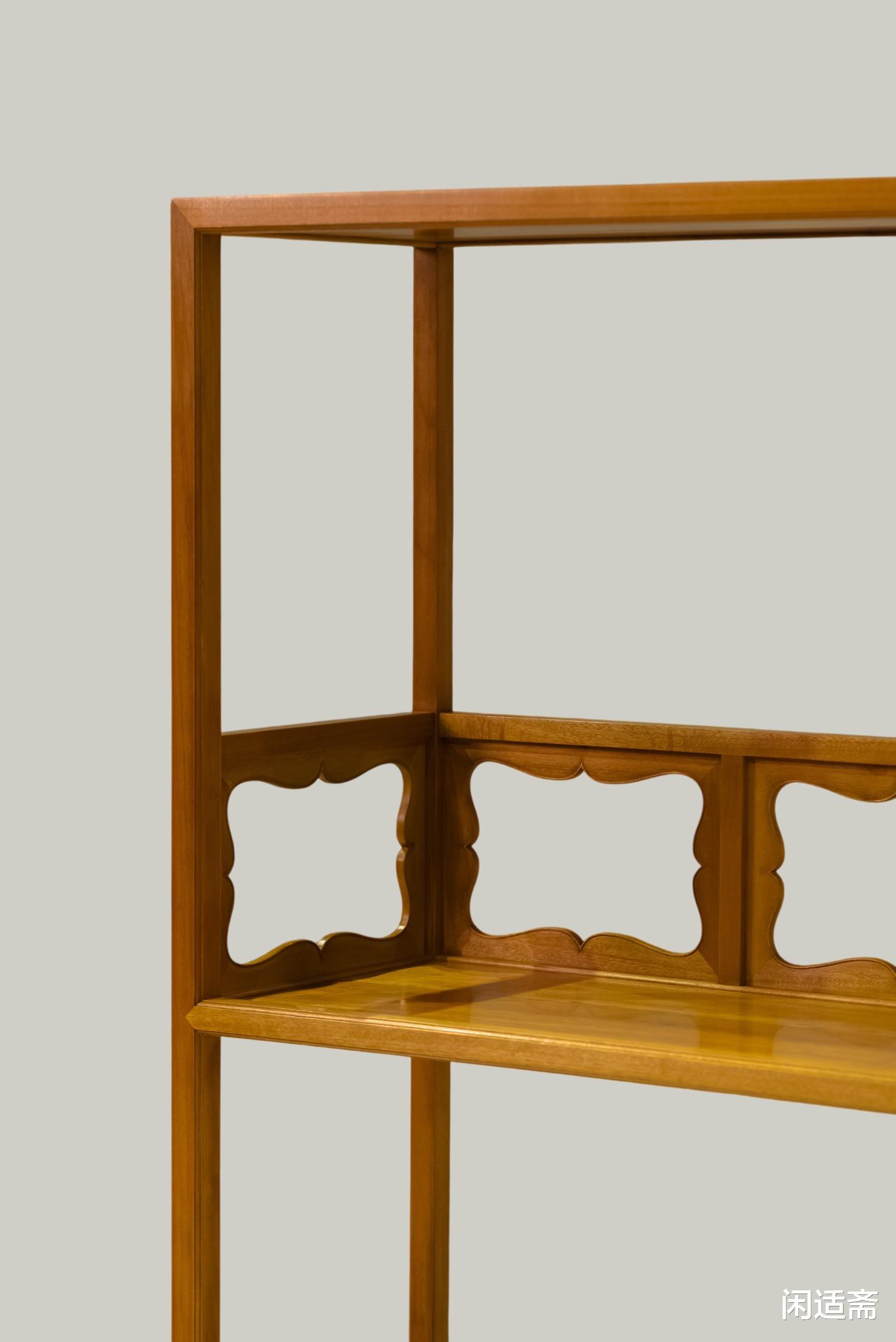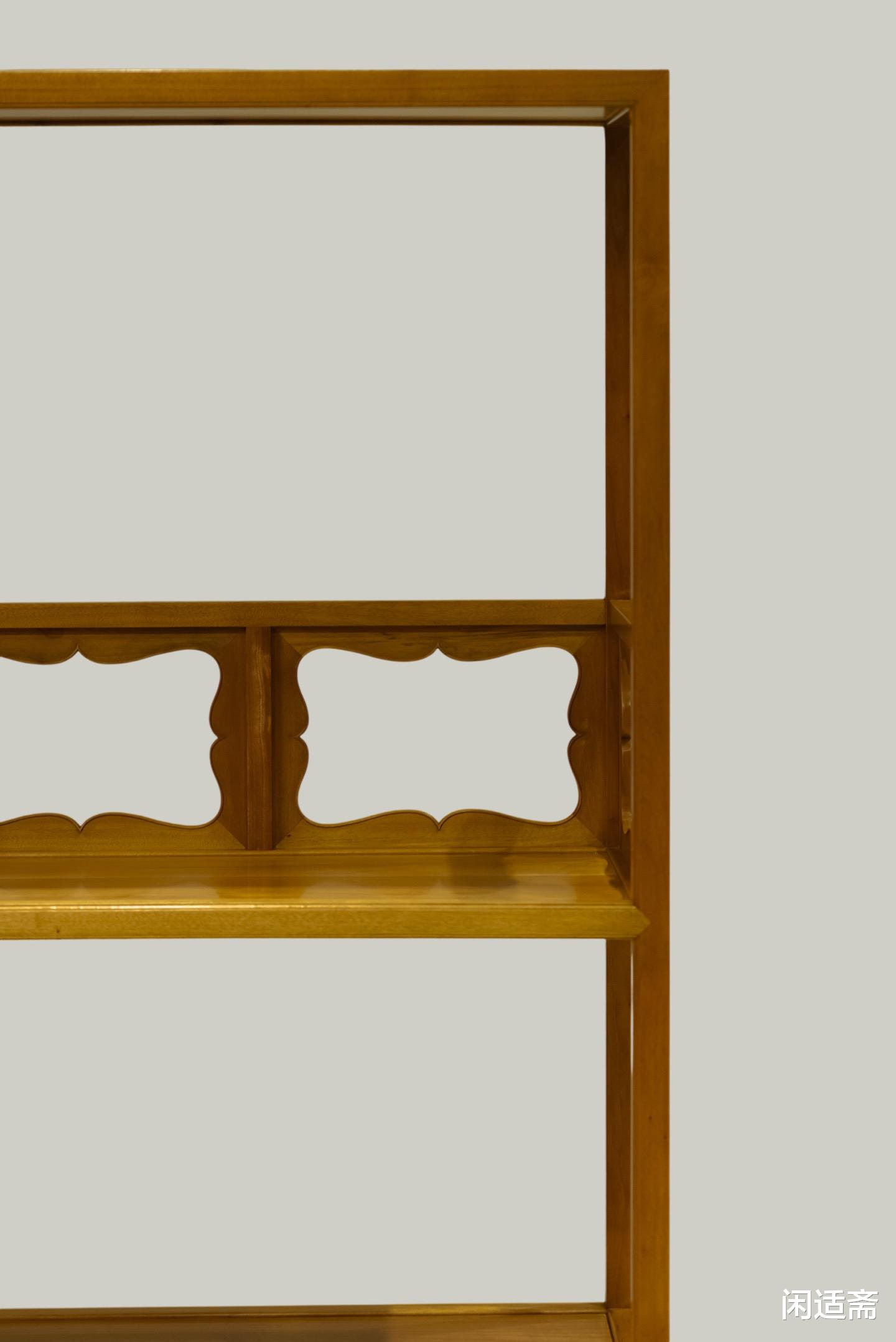 书架严格复刻伍嘉恩款三层壶门式圈口栏杆架格,形制规整、比例协调,完美承袭经典文人家具的雅致格调。第二层背部特设壶门式圈口牙板,造型古朴雅致,线条流畅自然,壶门轮廓圆润柔和,尽显东方器物的曲线之美;牙板底部铲阳线工艺精湛,线条柔美婉约,每一笔线条都藏着匠人的巧思,让简约的造型更具层次感与韵味。