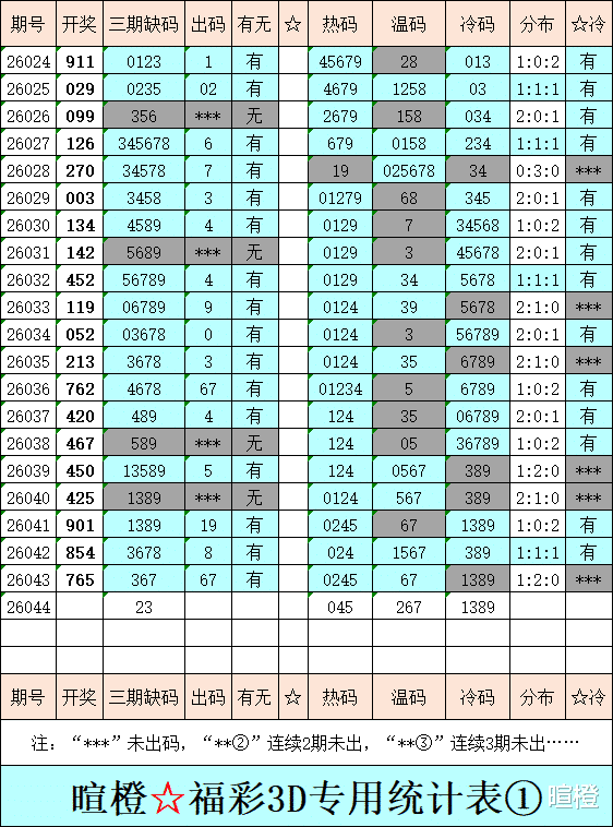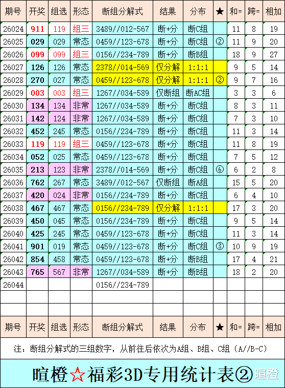 26044期:暄橙福彩3D综合条件(本期将在2月13日21:15开)一、上期回顾 ☆1、上期开奖号:7 6 5。2、和值= 18,跨度= 2。3、非常态组六,012路组合。4、热度分布(热:温:冷)1:2:0。二、本期条件 ☆1、三期缺码:23。2、热:045,温:267,冷:1389。3、断组分解式:0156//234-789。4、四胆:1569;三胆:569。三、术语解释 ☆1、三期缺码:0至9这十个自然数当中,未在近三期开奖号出现的数字。2、热度(热温冷):自然数0至9,在近七期开奖号中,出现3次及3次以上的数字,称为热码;出现2次的数字,称为温码;出现1次和未出现的数字,称为冷码。某个数字在开奖号中出现几个,就按几次计算。3、断组分解式:将0至9这十个自然数,分成三组数字,从前往后依次为A组(4码)、B组(3码)、C组(3码),一般情况下,有一组数字不出码,偶尔会有两组数字不出码。A组不出码的情况相对较少。断组为主,分解为辅。4、常态组六号码:同时包含大数、小数、奇数、偶数、质数、合数的组六号码,共有72注。统计表中,简称“常态”。5、非常态组六号码:全大数、全小数、全奇数、全偶数、全质数、全合数等六种形态的组六号码,共有48注。统计表中,简称“非常”。★提醒:彩市有风险,参与须谨慎!水平有限,仅供参考!