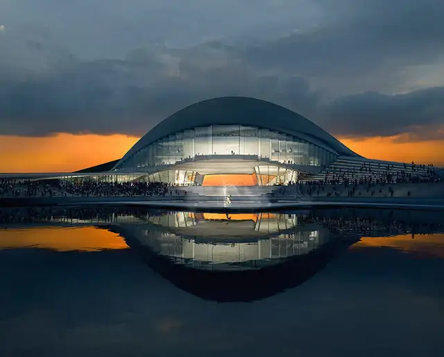 内部空间以展厅为中心,社交与教育功能区环绕其周。宽敞的走道不仅用于穿行,也适合停留与交谈,整座建筑的流线设计自然流畅,隐约呼应着水流的节奏。