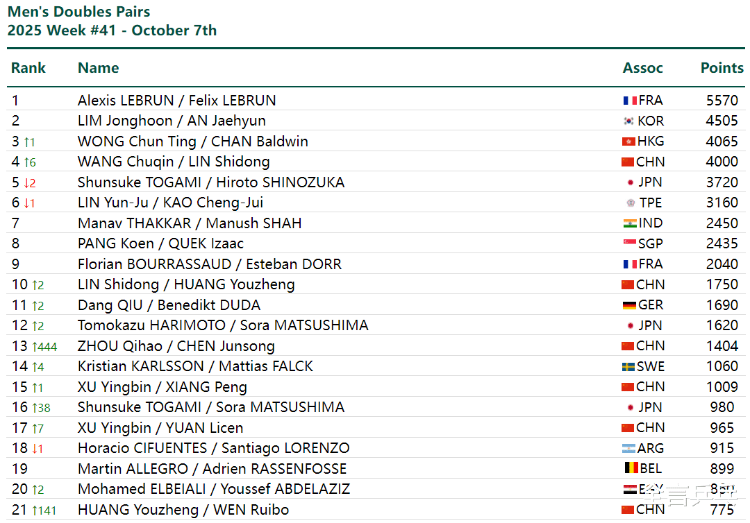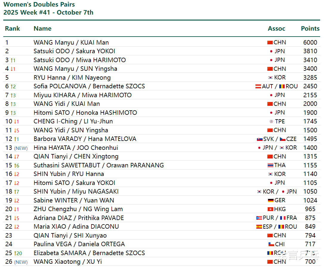 北京时间10月7日,国际乒联2025年第41周世界排名公布,受刚结束的WTT中国大满贯赛影响,许多组合的积分与位置发生变化,中法继续瓜分三项双打第一,许多组合进步神速,更多详情请看下文。